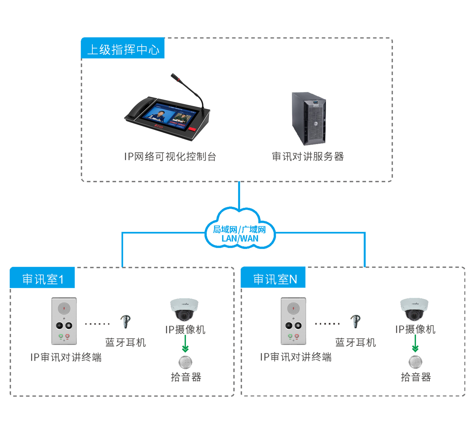 神州審訊對講系統(tǒng)?基于IP網(wǎng)絡音視頻通訊技術,可通過藍牙耳機接收遠程語音指令,可通過分機一鍵報警到監(jiān)控室主機進行可視對講。系統(tǒng)采用神州自主知識產(chǎn)權的數(shù)字音視頻技術,徹底解決了網(wǎng)絡對講時的回音、嘯叫。視頻采用H.264,廣播采用MP3、通話采用32K音頻采樣。
