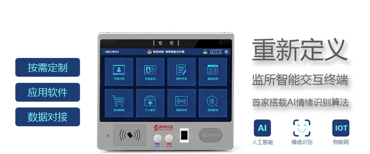 神州科技自主研發(fā)的監(jiān)倉智能交互式終端采用硬質(zhì)鋁合金外殼,CNC加工;10.2英寸觸摸顯示屏,1080P高清視頻;嵌入式安裝在監(jiān)倉內(nèi),具有雙鍵呼叫,可視對講,點(diǎn)播直播,在線購物,值班簽到,心情記錄,身份識別等功能。